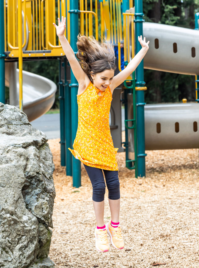 • The perfect play dress. Moves with them on the playground, resists the toughest stains and the sharpest tree branch, layers great for any weather.
